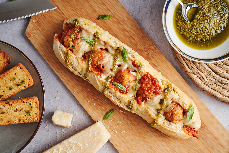Serving suggestions include simple and delicious 'spaghetti and meatballs' or even a gourmet 'meatball sub' sandwich with cheese and green pesto — see below.